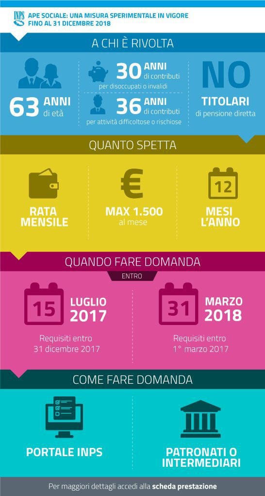 L’ Ape sociale, disciplinata dalla Circolare n. 100 del 2017, è una misura sperimentale in vigore fino al 31 dicembre 2018, destinata a soggetti che abbiano compiuto almeno 63 anni, non siano già titolari di pensione diretta e con almeno 30 anni di anzianità contributiva in presenza di determinati requisiti (36 anni per chi ha svolto per almeno sei anni in via continuativa attività difficoltose o rischiose).